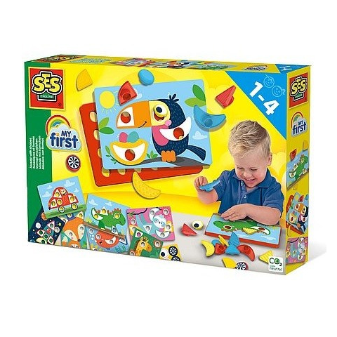 SES első mozaik formáim Készíts színes képeket a képkirakóval! A SES első mozaik formáim képkirakó egy puha lyukacsos táblát tartalmaz 8 db képpel és különböző formájú és színű műanyag elemekkel A SES első mozaik formáim képkirakó lyukacsos táblájára