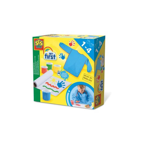 Készíts tenyérlenyomatokat, rajzokat ujjfestékkel! A SES Első ujjfestékem készlet négy tégely színes ujjfestéket tartalmaz, piros, sárga, zöld és kék színekben, valamint egy tekercs papírt, és egy kötényt, ami megóvja a picik ruháját a festéktől. Az ujjfesték már 1 éves kor felett használható, a játék fejleszti a művészeti érzéket, és kreativitásra sarkallja a picit. Az ujjfestékek egészségre ártalmas anyagot nem tartalmaznak, és könnyen le lehet mosni
