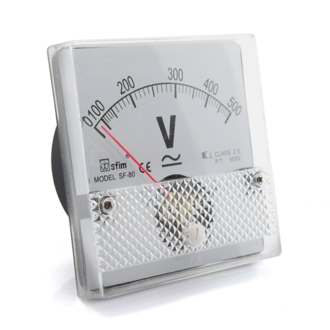 Analóg AC / DC feszültségmérő Jellemzők: - Működési elv: lágyvasas - Mérési tartomány: 0-500V - Pontosság: Class 1.5 - Kivágási méret: Ø64mm - Rögzítő furat távolság: 64,3x64,3mm, méret: M3 - Műszer mérete: 80x80x48mm