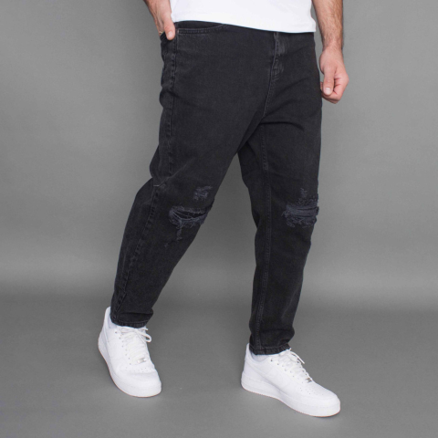 Tapered Fit, laza szabású fekete farmer, szaggatott, enyhén ülepes lefele szűkülő fazon, elöl-hátul zsebbel, cipzáros sliccel Modell: 185 cm/ 85 kg/ 33-as méret
