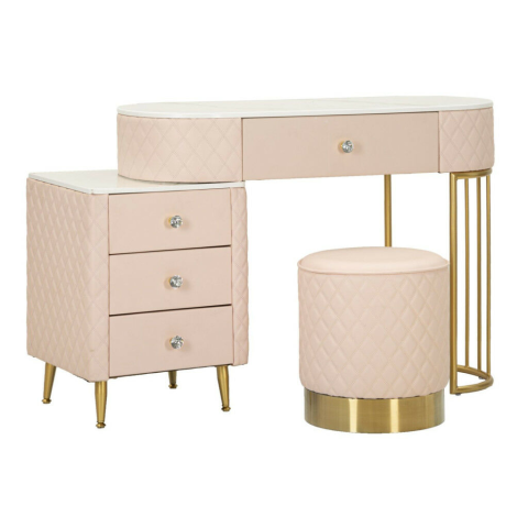 Elegáns sminkasztal székecskével: Tökéletes a hálószobába ✨ Ez a gyönyörű, rózsaszín sminkasztal minden nő álma! A steppelt műbőr kárpitozás és az arany fém szerkezet luxus érzetet kölcsönöz a bútornak. A márványhatású asztallap elegáns, a gyémánt a...