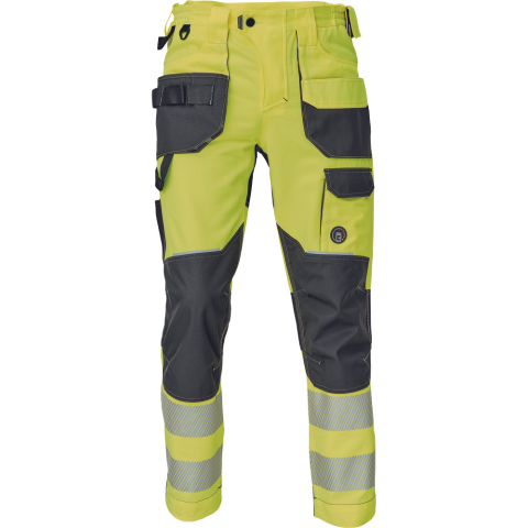 SHELDON HV nadrág sárga 66 • férfi jólláthatósági nadrág rugalmas derékkal és többfunkciós zsebekkel, 7 cm-es nyomtatott fényvisszavető csíkokkal • megerősített térdrész és térdzseb Oxford 600D anyagból térdvédő behelyezéséhez • ellenálló hármas fedőző
