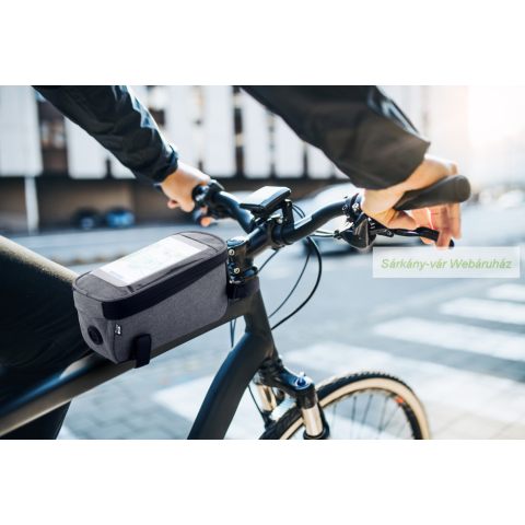 Párnázott, cipzáras kerékpárvázra erősíthető táska 600D RPET poliészter anyagból, állítható tépőzáras pántokkal és érintőképernyős mobiltartó rekesszel. Megkülnböztető RPET címkével. Méret: 215×110×105 mm Rendelésre: 5-10 nap! A dekoráció nem képezi az