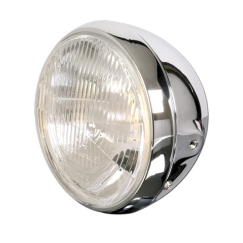 SHIN YO 7 hüvelykes fényszóró British-Style, H4 betéttel és domborított üveggelPurisztikus formájú fényszóró nagyon csillogó krómozott fém házzal és bordázott üveggel oldalsó felszereléshez. Az egyszerű design ideális választás klasszikus motorokhoz, road