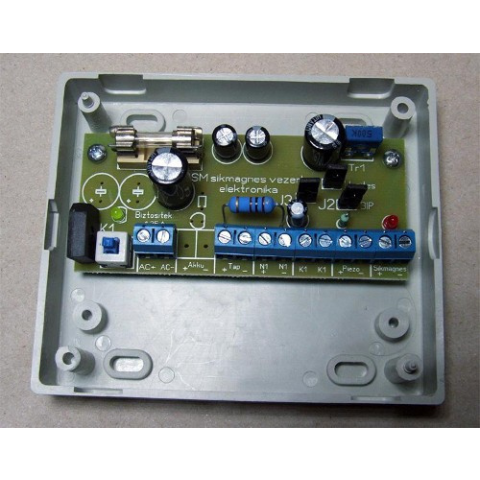 Síkmágnes, mágneszár vezérlő (doboz nélkül) - 12V AC vagy DC tápfeszültségű bemenet - ~12V DC kimeneti feszültség (nem stabilizált) - 0,7 A -es biztosíték. - Állítható időzítés. - Hangjelzés. - Záró kontaktus (nyomógomb) és feszültség (kaputelefon) i