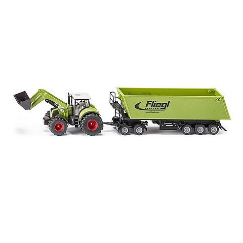 SIKU Claas Axion 850 traktor homlokrakodóval és Fliegl utánfutóval 1:50 Szállíts takarmányt a traktor utánfutóval! A SIKU Claas Axion 850 traktor homlokrakodóval és Fliegl utánfutóval egy zöld Claas Axion 850 traktor billenthető utánfutóval A SIKU Cla
