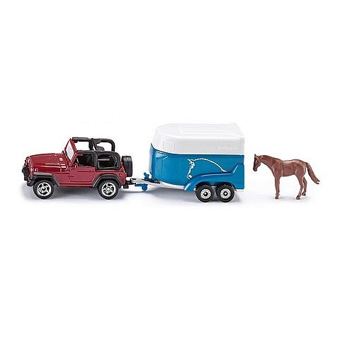 SIKU Jeep lószállító utánfutóval és 1 db lóval 1:87 Menj lovagolni a SIKU Jeep lószállító utánfutóval! A SIKU Jeep lószállító utánfutóval egy metálpiros színű tető nélküli személyautó bukócsövekkel, lószállító utánfutóval, lóval A SIKU Jeep lószállító