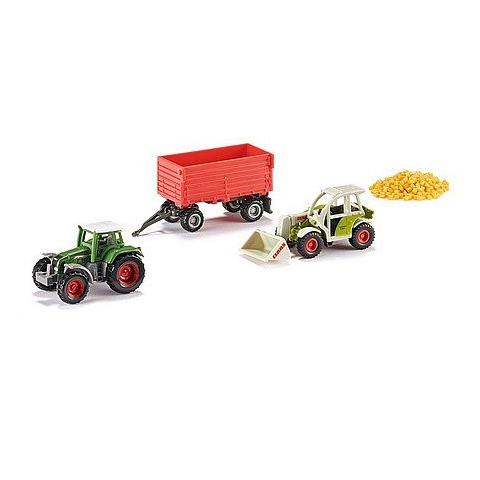 SIKU Mezőgazdasági munkagép készlet 1:87 Szállíts kukoricát a tárolóból! A SIKU Mezőgazdasági munkagép készlet egy teleszkópos Claas traktort, Fendt vontató traktort, egy 2 tengelyes billenős pótkocsit tartalmaz, amivel a kukoricát tudod elszállítani