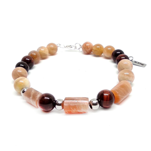 Figyelem! Nem szakad, nem nyúlik! Tartós ékszer. Az ékszer ásványai és tartozékai: – 8 mm-es Napkő gyöngyök – 8 mm-es vörös Tigrisszem gyöngyök – téglalap alakú Napkő – Ezüst színű díszek – M.King márkajelzésű nemesacél