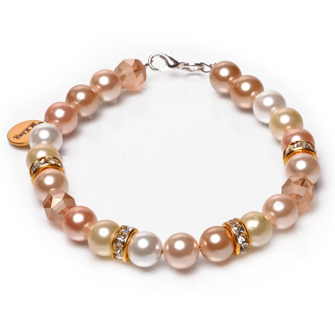 Nem szakad, nem nyúlik! Tartós ékszer. Az ékszer ásványai és tartozékai:– 8 mm-es fehér, arany és mályva színű mesterséges gyöngyök– 8 mm-es fazettált arany üveg gyöngy– Arany színű strasszos díszek– M.King márkajelzésű