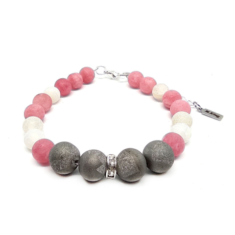 Figyelem! Nem szakad, nem nyúlik! Tartós ékszer. Az ékszer ásványai és tartozékai: – 10 mm-es Ezüst DRUZY Achát – 8 mm-es matt rózsa Jade – 8 mm-es roppantott fehér tűz Achát – Ezüst színű strasszos díszek – M.King márkajelzé