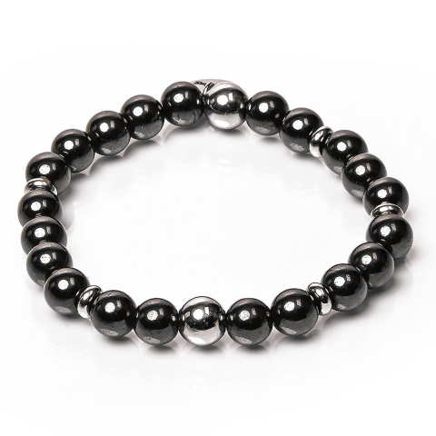 RUGALMAS KARKÖTŐ, a mérete választható. Az ékszer ásványai és tartozékai: – 8 mm-es ezüst színű és mágneses fekete hematit gyöngyök – Ezüst színű díszek – M.King márkajelzésű nemesacél logóbiléta a csatnál – Technika: