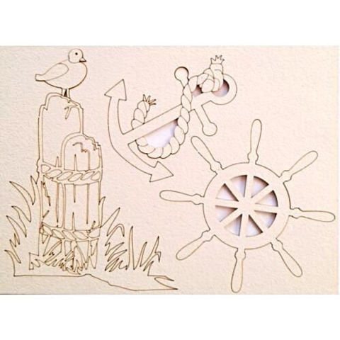 1 kép Sirály kikötő oszlopon, hajókormány, horgony, 145x195x1 mm-es táblán