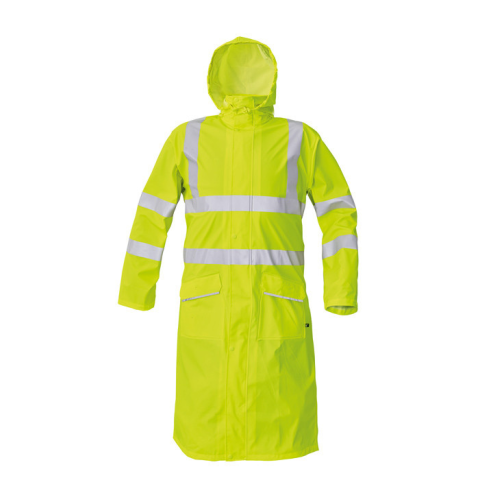 SIRET PU esőköpeny HV sárga XXL • víz-és szélálló, bő szabású esőköpeny gallérba hajtott kapucnival • hossza: 120 cm • húzózsinórral állítható kapucnival • 2 mély zsebfedős oldalzseb • patenttal szűkíthető mandzsetták • fényvisszavető csíkok az ujjakon