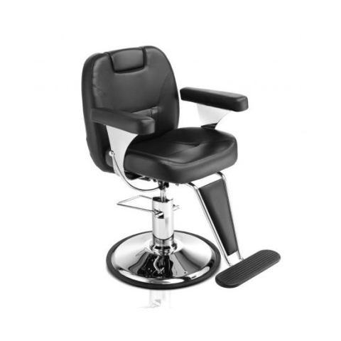 Kényelmes fodrász szék krómozott vázzal, fekete műbőr kárpittal, kör alakú gumírozott talppal, hidraulikus pumpával és állítható fejtámlával