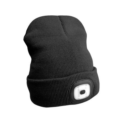 Sapka LED-es fejpánttal és pomponnal, beépített 180 lm-es LED-es fény (4x45 lm), 3 világítási mód - 50%, 75% és 100%, az akkumulátor élettartama akár 4 óra, a fejpánt levehető és a sapka mosható, hátul fényvisszaverő, újratöltés USB-n keresztül, fekete