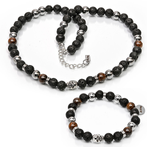1 kép Skull Extreme – Lávakő, hematit és bronzit exkluzív ásvány ékszerszett (nyaklánc + karkötő) Koponya