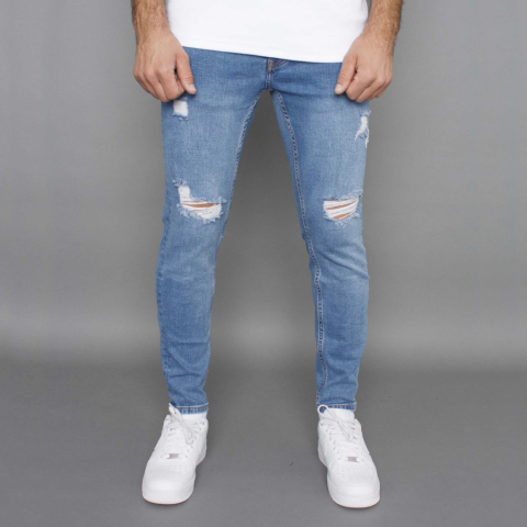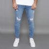Skinny fit, világoskék szűk szárú koptatott és szaggatott farmernadrág, zsebekkel és gombos sliccel Modell: 185 cm/ 85 kg/ 32-es méret