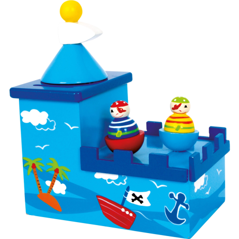 A spórolás még sosem volt ilyen szórakoztató! Ez a bájos, vár formájú fa persely egyben zenélő doboz kalóz motívummal. A két kalóz a dallamra örömmel forog, az érmék biztonságban maradnak, a levehető, mágneses figurák pedig játékra csábítanak. A felhúzható mechanika elemek nélkül működik, a minőségi fa kivitel pedig ideális kiegészítővé teszi a gyerekszobát.A kalóz motívumos fa vár elrejti a gyerek kincseit, és felhúzás után ismert dallamot játszi