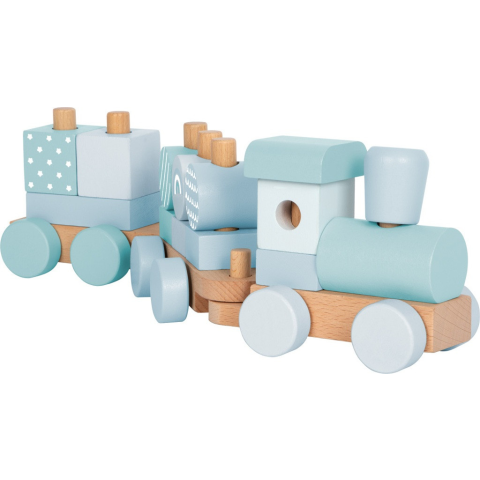Drevený vláčik v pastelových farbách s jemnými motívmi nadchne každé malé dieťa! Lokomotíva s dvoma vagónikmi a 14 farebne zladenými stavebnými dielikmi pozýva na skladanie, stavanie i voľnú hru. Kocky sa nasadzujú na drevené tyčky, a rozvíjajú tak je