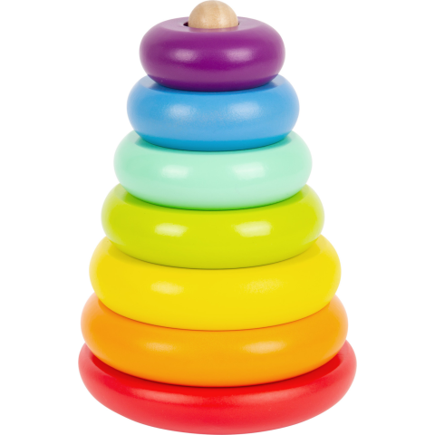 Poškodený obal. Nový tovar bez závad. Dúha na skladanie a vkladanie! Táto stohovacia veža žiari jasnými dúhovými farbami a drevený materiál, ktorý sa ľahko drží, nabáda aj tie najmenšie deti k triedeniu rôznofarebných krúžkov podľa ich veľkosti a farb