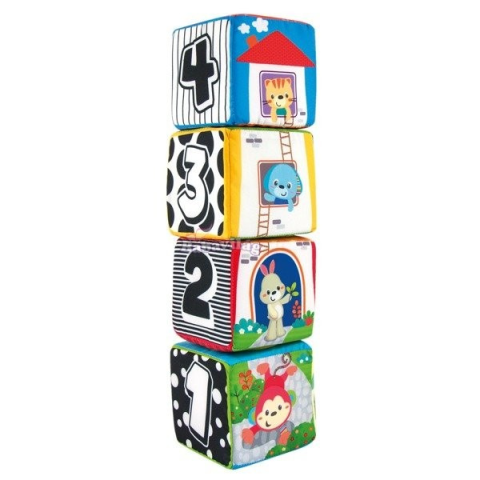 4 puha, négyzet alakú blokk, amellyel a baba megtanulja az 1–4 számokat, ábrákat, állatokat, és megtanulja rendezni a képeket. Különböző anyagszerkezetek. Biztonságos tükörrel rendelkezik. A blokkok piramisokat képeznek, és képsorozatot alkotnak. Tömb