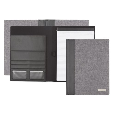 Vászon és PU bőr borítású A4-es iratmappa, 20 lapos vonalas jegyzettömbbel. Borítón jól emblémázható fém lemez található.