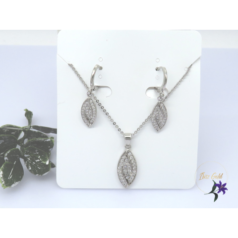 Antiallergén szett nyaklánc, fülbevaló Szolid de mégis elegáns levél alakú medál cirkóna kövekkel diszítve Szin: rodium ( ezüst szín) Méret: lánc 45 cm Medál: 25x10mm Fülbevaló:30x7mm Zár karika .átmérő 10mm