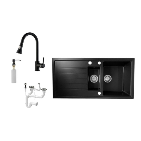 Solarys gránit mosogató nagy medencével, egy kisebb gyümölcsmosó medencével és csepegtetővel. A csomag részét képezi egy 80 cm-ig kihúzható, zuhanyfejes csaptelep, ami megkönnyíti a mosogatást és az edények feltöltését. Továbbá egy fekete mosogatószer ada