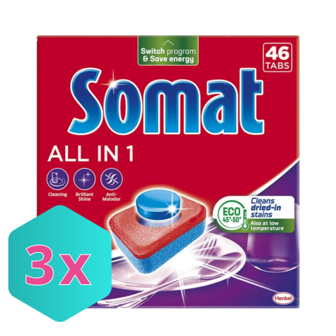 A Somat All in 1 Extra egy 46 darabos mosogatógép-tabletta csomag, amely hatékonyan tisztítja az edényeket és eltávolítja a makacs szennyeződéseket is Főbb jellemzők: All in 1 Extra formula: Tisztít, vízlágyít, és véd a vízkőlerakódások ellen. Hatékon