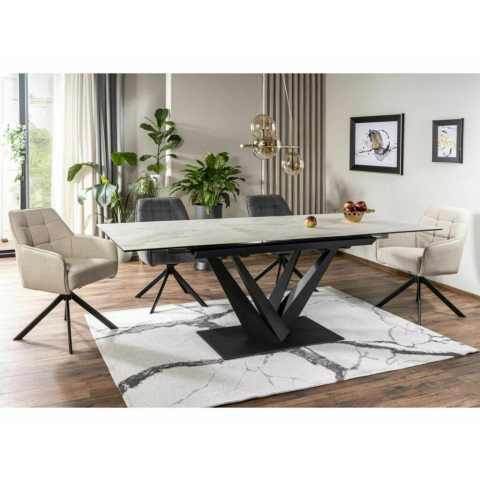 Modern, bővíthető étkezőasztal edzett üveg és kerámia lappal, amely tökéletesen ötvözi az elegáns megjelenést a praktikussággal. A matt fehér asztallap és a matt fekete fém váz kombinációja időtlen dizájnt kölcsönöz. Modern és elegáns bővíthető ét...