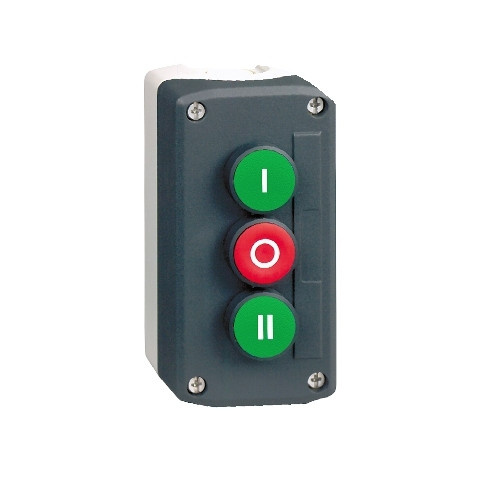 XAL-D339 Tokozott nyomógomb 3 gombos Schneider \nSötétszürke tokozat, zöld sülly./piros sülly./zöld sülly. nyomógomb Ø22. termékcsalád: Harmony XALD - termék vagy komponens típusa: komplett ellenőrzőállomás - készülék rövid megnevezése: XALD - termék fe