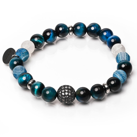 RUGALMAS KARKÖTŐ, a mérete választható. Az ékszer ásványai és tartozékai: – 8 mm-es fagyos kék és fehér achát gyöngyök – 8 mm-es kék tigrisszem gyöngyök – 10 mm-es fekete strasszos pavé dísz – Ezüst színű fémdíszek – M.