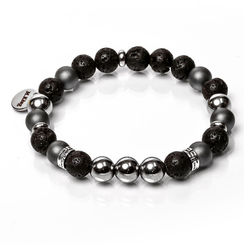 RUGALMAS KARKÖTŐ, a mérete választható. Az ékszer ásványai és tartozékai: – 8 mm-es ezüst színű és szürke matt hematit gyöngyök – 8 mm-es fekete lávakő gyöngyök – Ezüst színű díszek – M.King márkajelzésű nemesacél log