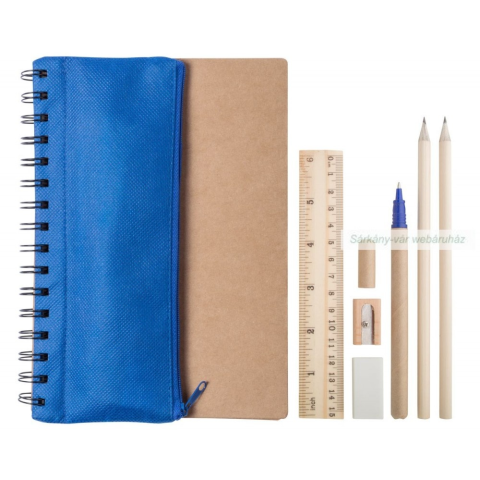 Újrahasznosított papírból készült spirál jegyzetfüzet 70 lappal és non-woven tolltartóval Méret:155×210×9 mm Rendelésre: 5-10 nap! Tartalma:vonalzó,2 grafitceruza,radír,hegyező és golyóstoll.Kék tollbetéttel szállítjuk.