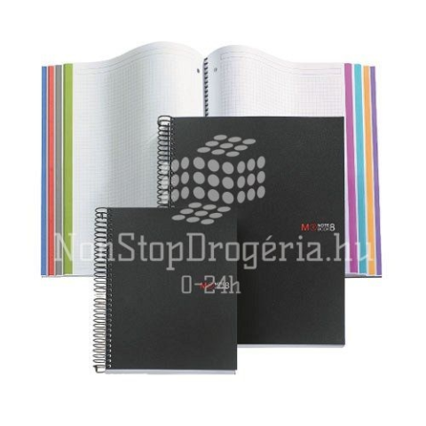 MIQUELRIUS Színes PP borító. Mikroperforált és lyukasztott lapok. Nyolc színregiszter. 70 g-os ofszet nyomású beloldalak. Visszaforduló spirálozási technika.