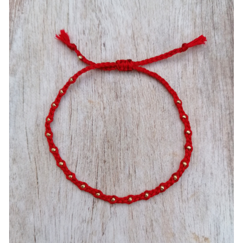SPUN Red&Gold karkötő. Apró arany színű gyöngyökkel kézzel készült fonott karkötő. Egyedi kézzel készített fonott karkötő Mérete állítható. Aranyozottt gyöngy mérete: 2mm A vörös fonalat a bal csuklón viseljük. Ennek oka, hogy az energetikai tano