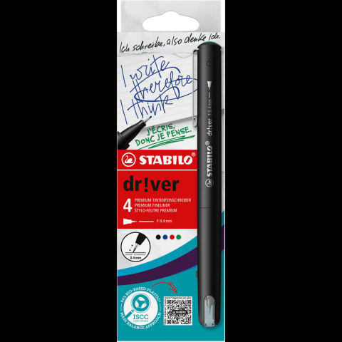 STABILO dr!ver fine szett, 4 db, zöld, piros, kék, fekete (4006381614986) filctoll, marker árgrafikon
