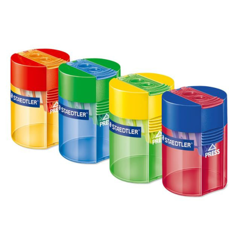 Hegyező, kétlyukú, tartályos, STAEDTLER 512, vegyes színek - kétlyukú hegyező sztenderd méretű grafitceruzák és jumbo (vastag) grafitceruzák és színesceruzák számára - oldalán található gombbal nyitható, ezáltal nem engedi kihullani a forgácsot - fedél