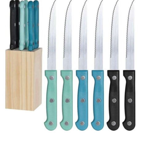 Az 6+1 részes késkészlet vegyes színű műanyag nyéllel, különböző élelmiszerek sokoldalú és könnyű szeletelését teszi lehetővé