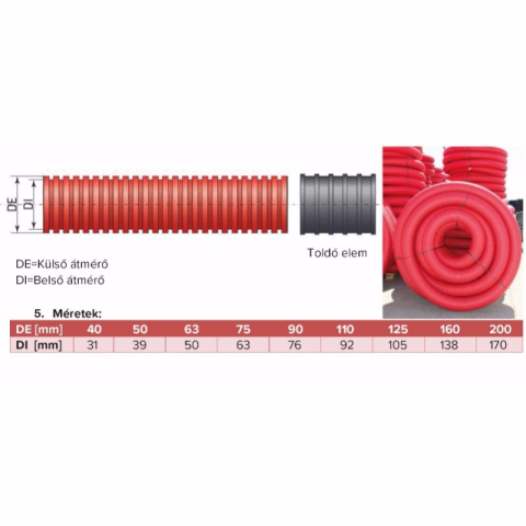 STI1451 50-es Közműcső tekercses, piros-fekete 50/39 \nNagysűrűségű polietilénből (PEHD), villamos és távközlési kábelek föld alatti védelmére. \nA külső fal hullámosított, hogy mechanikai ellenállást biztosítson, míg a belső fal sima, hogy megkön