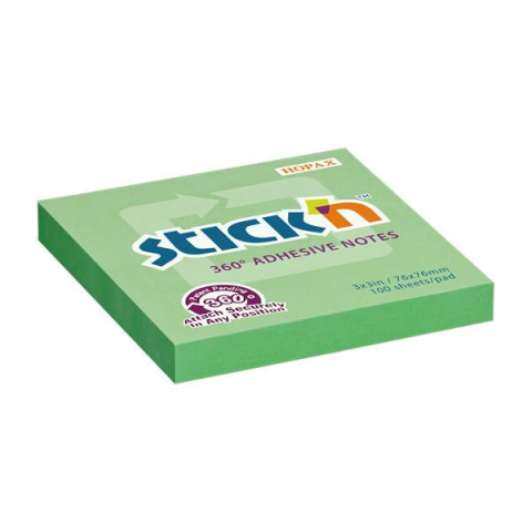 Öntapadó jegyzettömb, 76x76 mm, 100 lap, STICK N „360°, zöld Egyedi szabadalmaztatott technológiával készült STICK'N öntapadó jegyzettömb -négyzet alakú ragasztócsík -jegyzeteit bármilyen irányban írhatja -erősebb tapadás a különböző felületekre -100