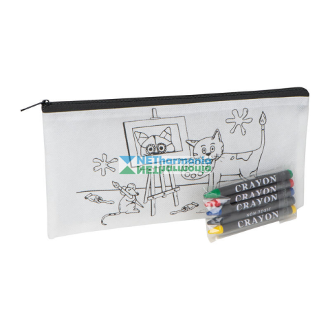 Nemszőtt anyagú tolltartó 5 viaszkrétával (sárga, fekete, kék, piros és zöld), gyerekbarát, színezhető mintával nyomtatva. Ideális a gyermekek foglalkoztatására és képzeletük ösztönzésére