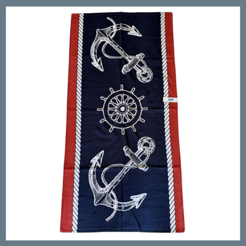 Strand törölköző 70 x 140 cm - Horgony mintás 289Ezzel a klasszikus tengerész motívumokkal díszített strandtörölközővel hozd el a tenger hangulatát a strandra vagy a medencéhez! A törölköző közepén egy nagy hajókormány található, fölötte és alatta pedig egy-egy horgony díszíti, melyek harmonikus és elegáns megjelenést kölcsönöznek.Kiváló minőségű, puha és gyorsan száradó anyagból készült, amely kényelmes tapintású és hatékonyan felszívja a ned