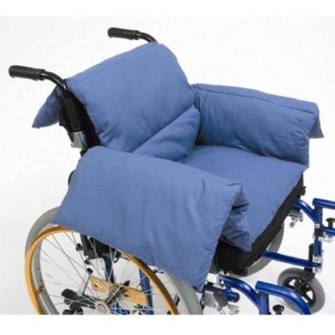 Kerekesszék kipárnázó párna. Kerekesszék ülésének kipárnázására, puha kényelmesebbé tételére szolgál. A párna T alakú, így körbe a háttámla és a kartámaszok kipárnázására is megfelelő. Strapabíró és ellenálló kék huzattal. Mérete: szélesség 128 cm x hossz