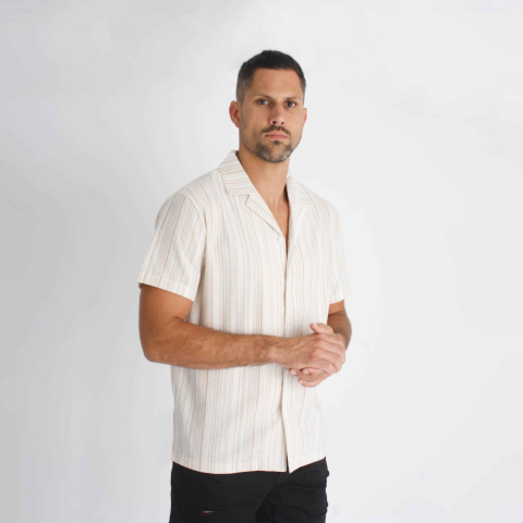 Regular Fit, bézs színű csíkos ing, vékony lezser anyagból, gallérral és egyenes alsó szegéllyel Modell: 185 cm/ 85 kg/ L-es méret