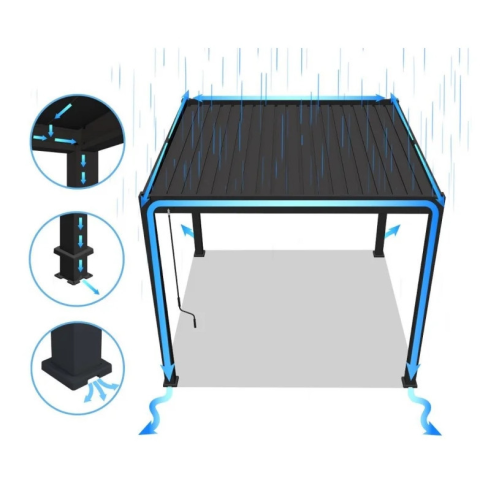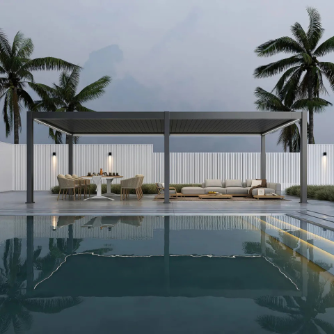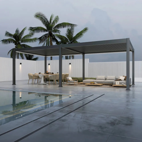 A DELUXE PRO AUTOMATIC + LED 4x6m antracit terasz pergola önálló árnyékolóként bármelyik kertben elhelyezhető, de közvetlenül az épülethez is rögzíthető. Teljes mértékben alumíniumból készült szerkezete 136 mm széles oszlopokra épül, amely képes ellenálln