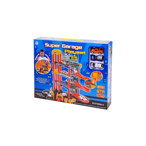Tartsd az autóid egy nagy, négy szintes garázsban! A Super négyemeletes parkolóház 3 autóval egy műanyagból összeállítható garázs, rámpával, lifttel felszerelve. Az autókat az emeleteken tudod tárolni, és ha valamelyiket el akarod vinni tankolni vagy lemosatni, a spirálos lehajtón keresztül tudod elhagyni a parkolóházat. Az autó előtt benzinkutat, autómosót találsz, a készlet 3 darab fém kisautót is tartalmaz. Autók mérete: 8 cm.