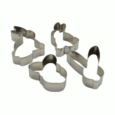 Anyaga: rozsdamentes acél Tartalma:4 db különböző nyuszi forma Méretek: 9,5*7,5*2 cm; 8,5*5,5*2 cm; 7,5*6*2 cm; 9*6,5*2 cm Bruttó súly: 30g Nettó súly: 18 g Tisztítása: Semleges folyékony mosogatószerrel mossa el! Kerülje a karcosodást okozó szerek és esz