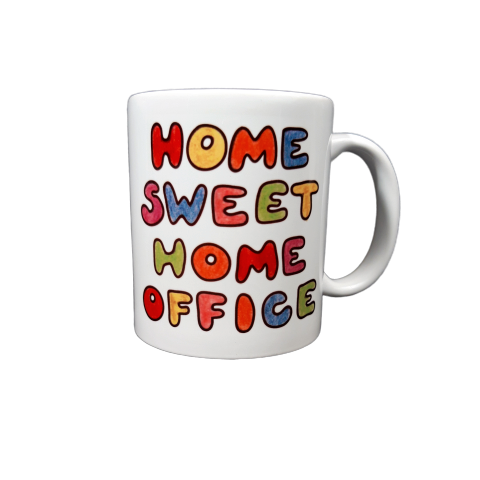 Sweet Home Office bögreSweet home office bögre, színes felirattal díszitve.A porcelán bögre saját kézi rajz alapján szublimációs technikával lett feliratozva, mikrohullámú sütőbe betehető, mosogatógépben tisztítható.